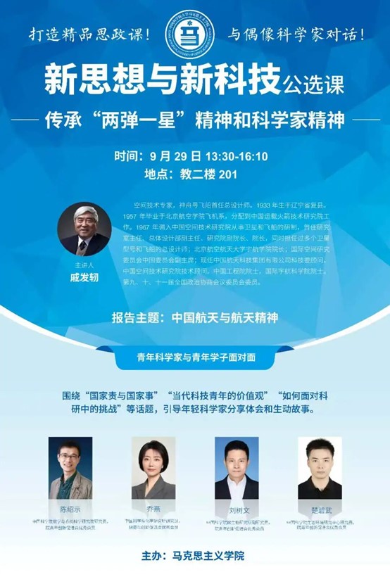 《新思想与新科技课程》是国科大马克思主义学院打造的精品思政课品牌,共设置8个专题授课模块,聚焦基础前沿、人工智能、量子信息、空天科学等研究领域,旨在深入学习贯彻习近平总书记关于科技创新的重要论述,由思政课教授与优秀科学家讲授新思想、新科技与科学家精神,引导学生深刻领略科技创新前沿,传承弘扬“两弹一星”精神,在迈向新征程中自觉肩负科技强国的使命担当。课程已邀请中国工程院院士、神舟号飞船首任总设计师戚发轫,中国科学院空天信息创新研究院研究员徐颖,中国科学院声学研究所副所长杨波开展授课。